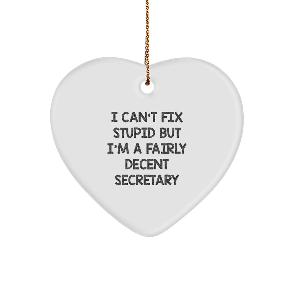- Our Funny Secretary Heart Ornament is a unique and funny way to show your appreciation for your Secretary's hard work and dedication. Made from sturdy MDF and high-gloss plastic, this ornament is lightweight and resistant to breaking. The funny quote 'I Can't Fix Stupid' is a great way to show your appreciation for your Secretary's hard work and dedication. Whether you're looking for a gift for a male or female Secretary, this ornament is a great choice.