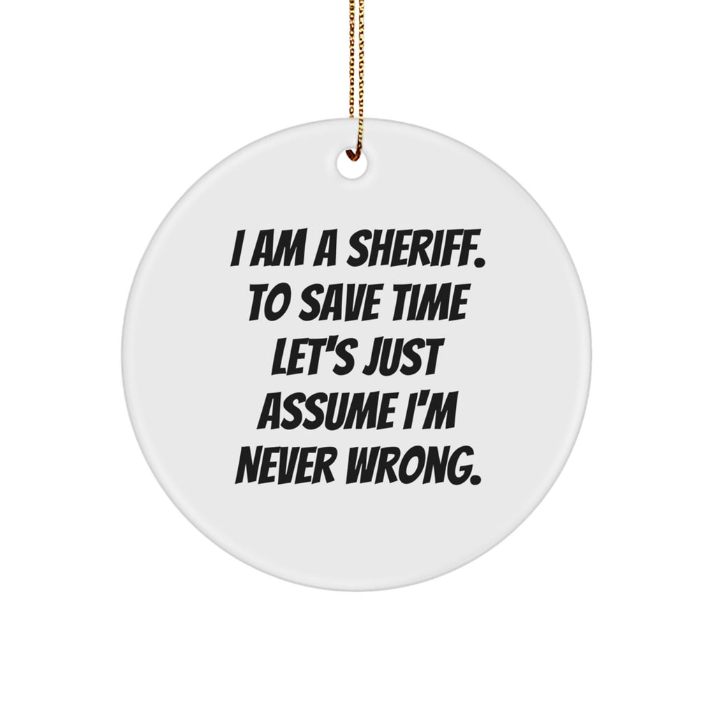 - Bring some 'I Am A Sheriff. To Save Time Let's Just Assume I'm Never Wrong.' humor to your home with this sheriff-themed Circle Ornament, featuring vibrant colors and a fun design that's perfect for display on your Christmas tree or in a decorative bowl.