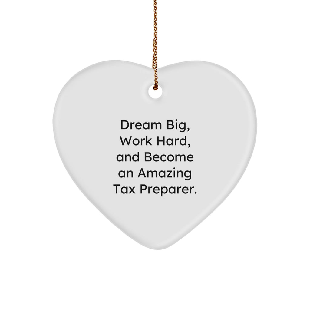 • The inspirational quote, 'Dream Big, Work Hard, And Become An Amazing Tax Preparer,' is a great reminder to always strive for excellence and never give up on your dreams. This Heart Ornament is a beautiful way to display this quote and show your loved ones that you care.