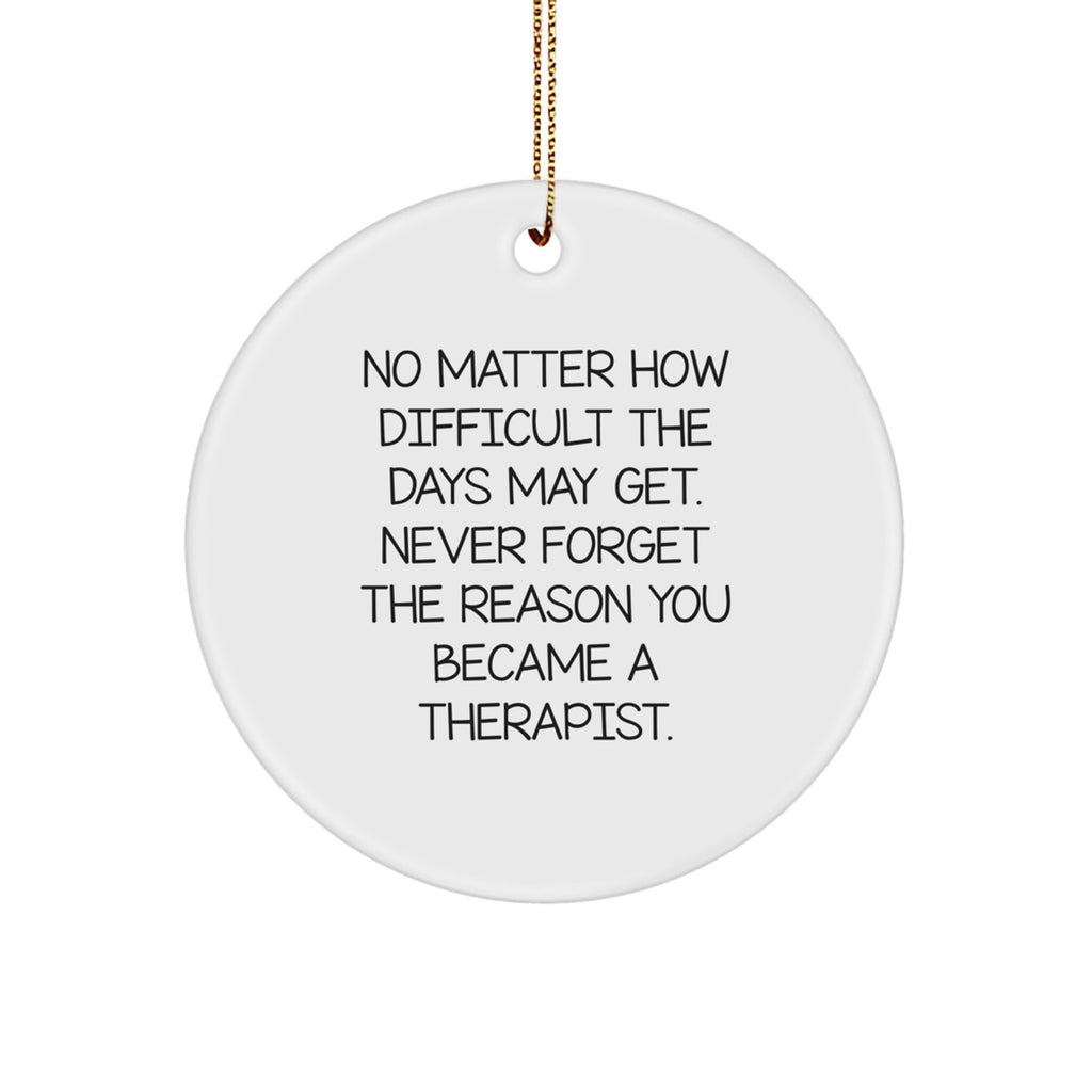 - Start a new holiday tradition with this thoughtful 'No Matter How Difficult The Days May Get. Never Forget The Reason You Became A Therapist.' Circle Ornament, crafted with durability and attention to detail, making it a meaningful gift for fellow therapists and a beautiful addition to your own home.