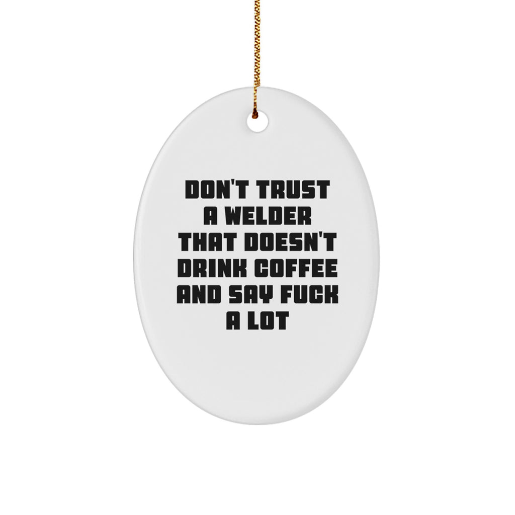This Oval Ornament is a must-have for any Welder, featuring the quote 'Don't Trust A Welder That Doesn't Drink Coffee And Say F--k A Lot'. It's the perfect way to add a touch of personality to your workspace or home office, and it's sure to spark conversations with fellow Welders and non-Welders alike. The quote itself is a testament to the dedication and passion that Welders bring to their craft.