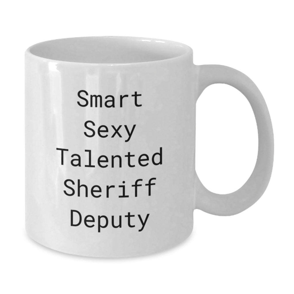 • This Smart Sexy Talented Sheriff Deputy quote white coffee mug is a unique and thoughtful gift for any Sheriff Deputy lover. The quote on the mug is funny and will surely make anyone with a sense of humor laugh. The white color and ceramic material make it a stylish and modern addition to any kitchen.