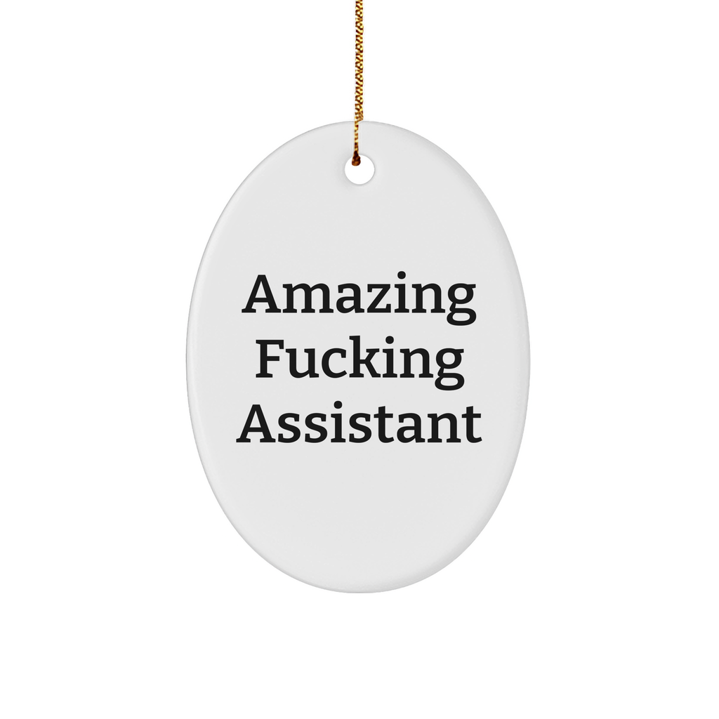 Amazing F--king Assistant Oval Ornament, Oval Shaped, White, Christmas Unique Gift for Men, Funny Quote, Durable MDF Material, High-Gloss Finish, Perfect for Stress-Free Decorating
