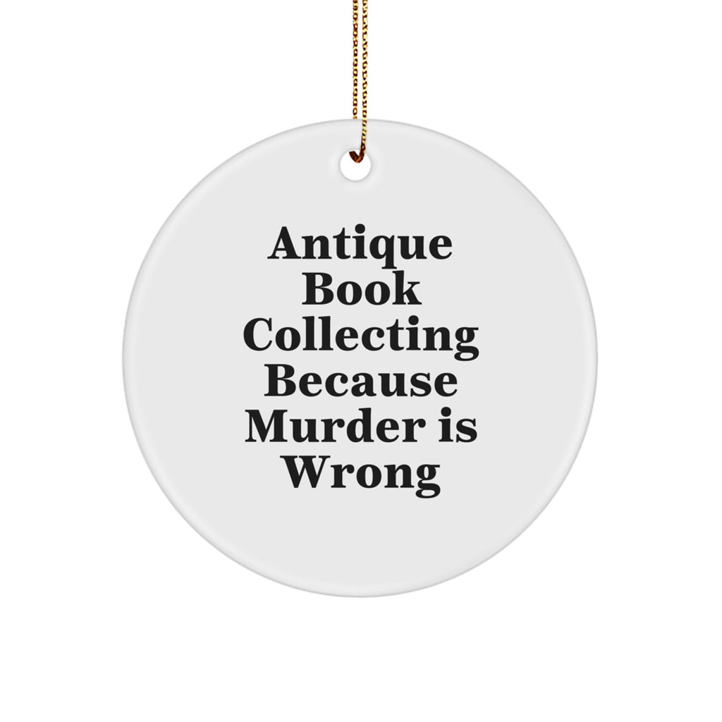 - Experience the art of antique book collecting with this stunning Circle Ornament, featuring a unique 'Antique Book Collecting Because Murder Is Wrong' quote that will resonate with any bookworm, and is sure to spark conversations and inspire a sense of nostalgia.