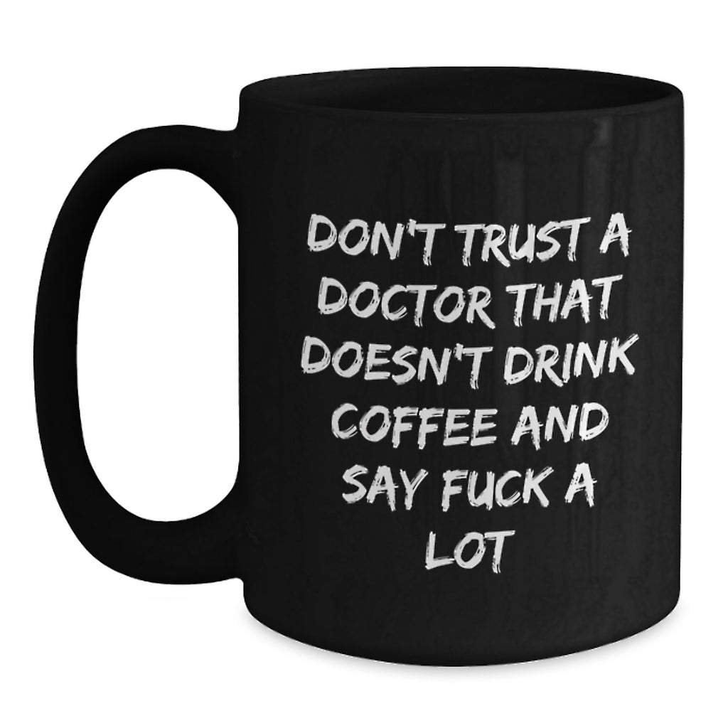 - This funny black coffee mug is the ideal gift for any doctor, especially those who love to drink coffee and say funny things. The quote 'Don't Trust a Doctor That Doesn't Drink Coffee And Say F--k A Lot' is sure to bring a smile to their face. Available in 11oz or 15oz, our ceramic mug is microwave and dishwasher safe, making it easy to clean and use. Perfect for gifting to doctors, friends, or family members, this unique coffee mug is sure to be a hit.