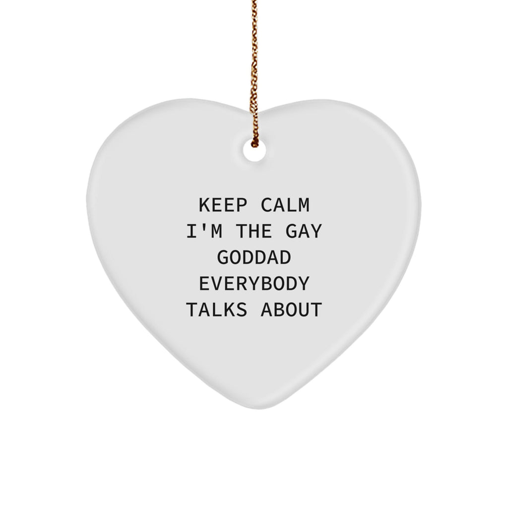 Are you a fan of the funny and inspirational 'Keep Calm I'm The Gay Goddad Everybody Talks About' quote? Do you want to find a unique gift for the Goddad in your life? Look no further! Our heart ornament is the perfect way to show your love and appreciation for this special person. Made from sturdy MDF with a high-gloss plastic finish, this ornament is vibrant, long-lasting, and resistant to breaking. It's also lightweight, making it a great choice for households with children or pets. The festive gold cord that comes with it is perfect for stress-free decorating. Whether you're a Goddad or a friend of a Goddad, this ornament is sure to bring a smile to their face. So why wait? Get your 'Funny Gay Goddad Heart Ornament' today and make someone's Christmas a little brighter!
