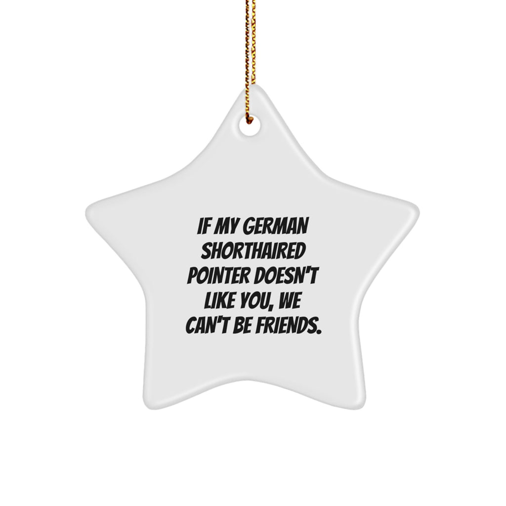 • This funny German Shorthaired Pointer Dog star ornament is a unique and thoughtful gift for your friend or family member who owns a German Shorthaired Pointer Dog. The vibrant and funny quote, 'If My German Shorthaired Pointer Doesn't Like You, We Can't Be Friends,' is sure to bring a smile to their face.