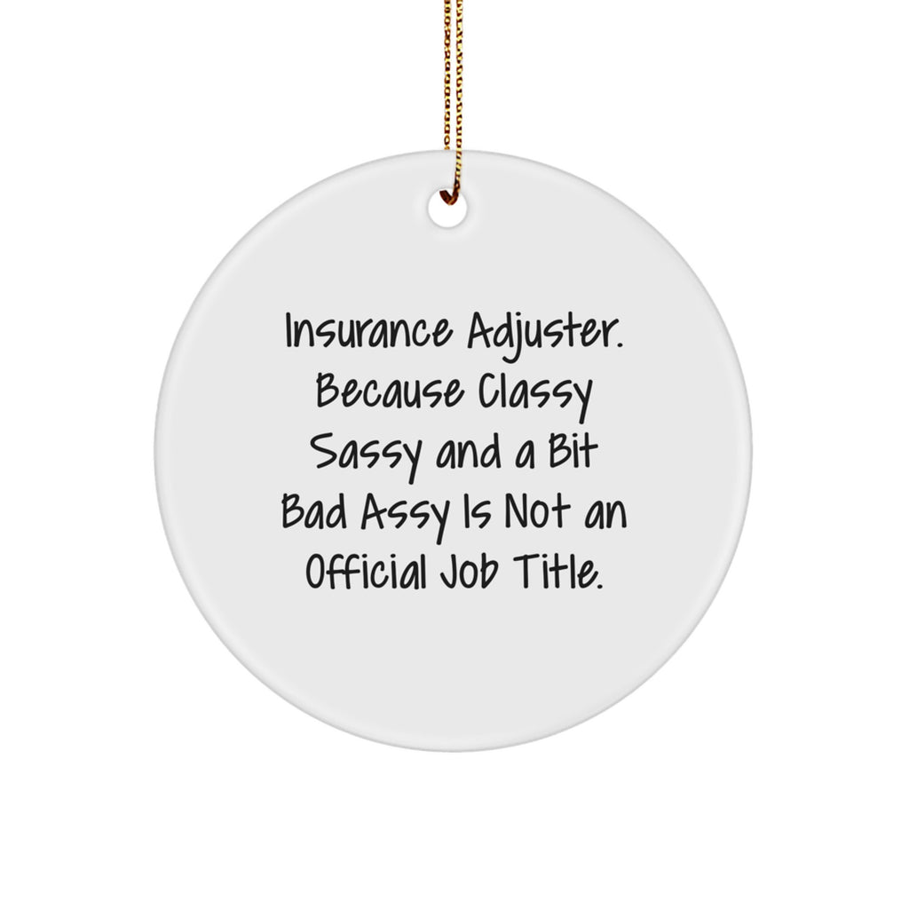 - This Circle Ornament is a thoughtful gift for any Insurance Adjuster. It's a unique and humorous way to show your appreciation for their hard work and dedication. And with its festive gold cord, it's easy to hang and display in any room.