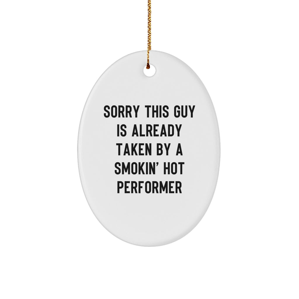 - Add a touch of glamour to your holiday decor with our 'Sorry This Guy Is Already Taken By A Smokin' Hot Performer' oval ornament, perfect for the performer in your life. Crafted from durable MDF with a high-gloss plastic finish, this ornament is lightweight and resistant to breaking, making it a great choice for households with children or pets.
