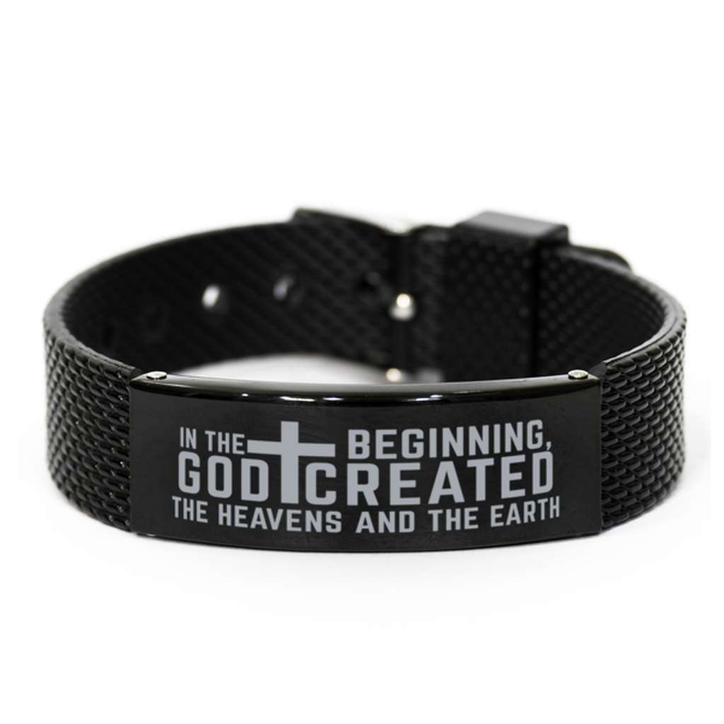 Motivational Christian Black Shark Mesh Bracelet, In the beginning, God created the heavens and the earth., Inspirational Christmas , Family, Anniversary Gifts For Christian Men, Women, Girls & Boys