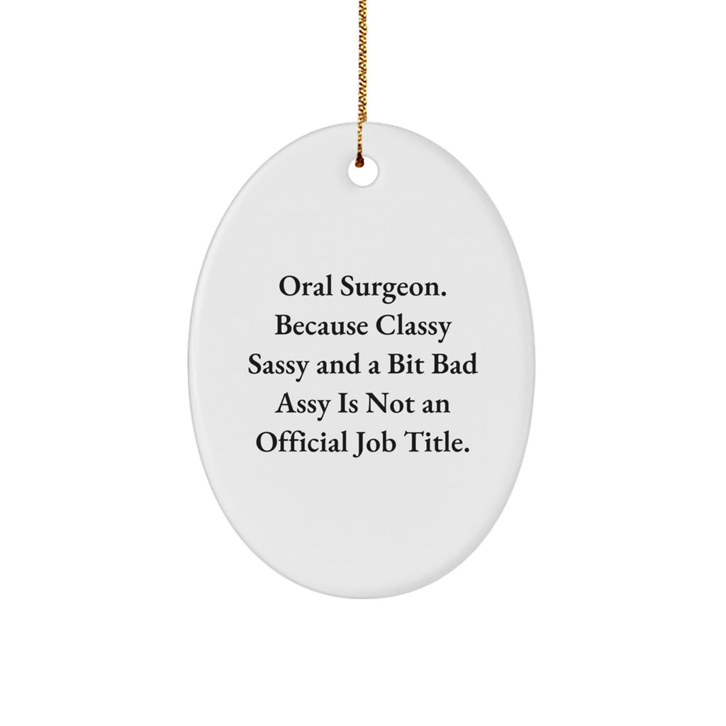 Then you're in the right place! Get ready to add a dash of sass and a pinch of humor to your holiday decor with our unique Oval Ornament featuring the quote 'Oral Surgeon. Because Classy Sassy And A Bit Fearlessy Is Not An Official Job Title.'